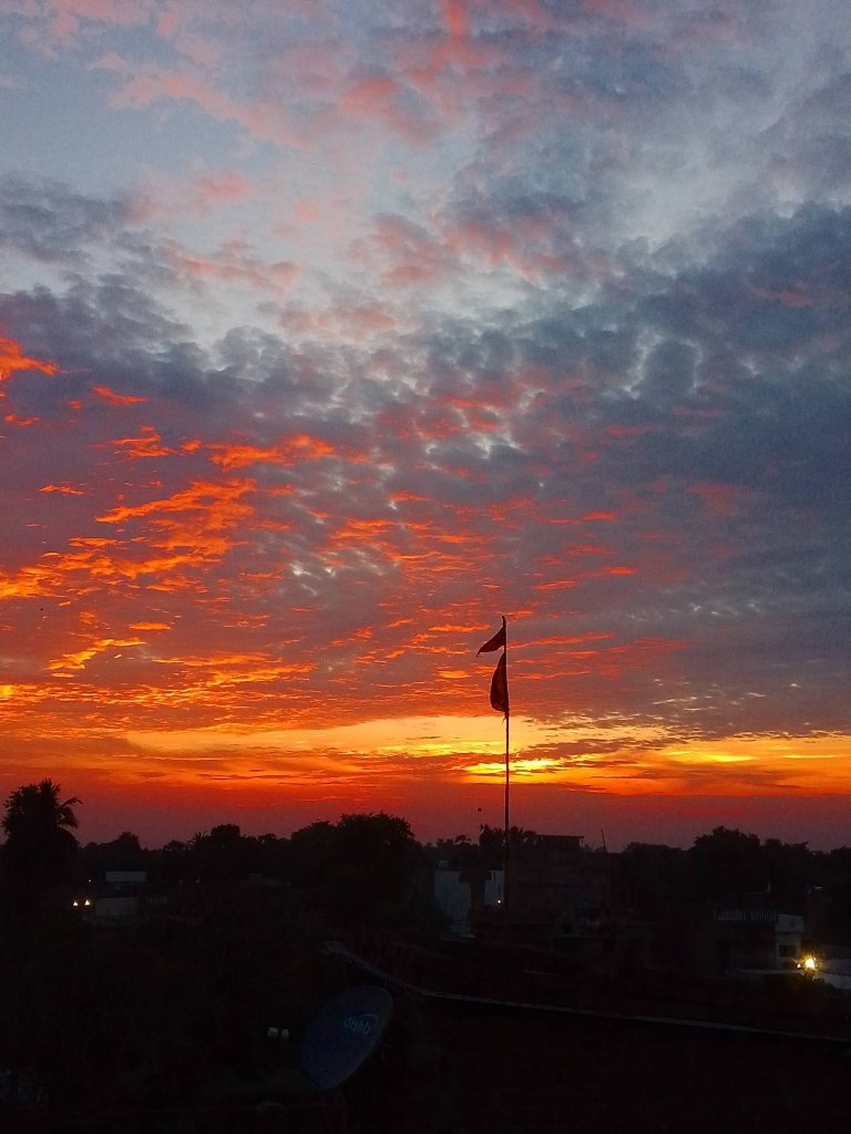 “In the embrace of twilight, the evening sun paints the clouds like lava from a volcano, while a solitary flag stands tall, casting a poignant silhouette. A profound reminder of the interplay between our emotions and the impermanence of existence, where beauty and turmoil coexist in the ever-changing canvas of life.”